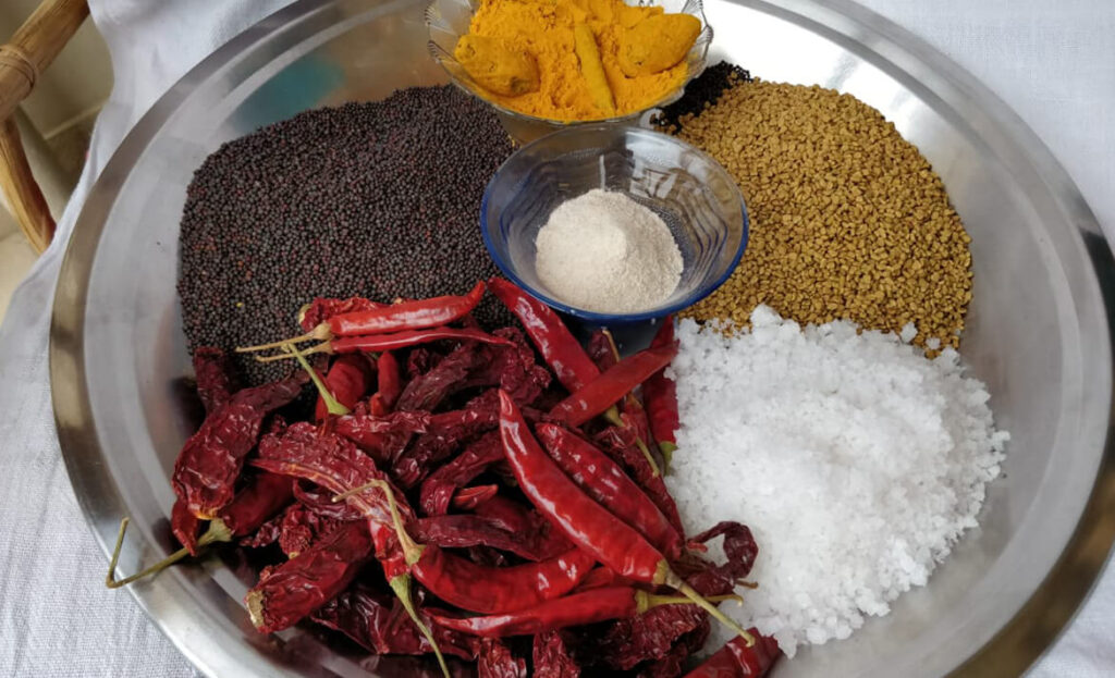 And as per tradition, come mango season and our team members pluck the pickling mango varieties at just the right stage – when they are mature, but still unripe and firm. Two varieties of these organic mangoes ( Amlet and Mallika) are then processed into delicious, taste bud-tickling pickles and the recipe goes like this: